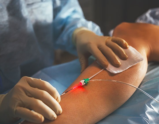 - Эндовенозная лазерная коагуляция. ЭВЛК вен предполагает ее прокол. В просвет устанавливается катетер с лазерным световодом. Под воздействием излучения пораженная вена меняет структуру и рассасывается, а кровь перенаправляется в здоровые вены.