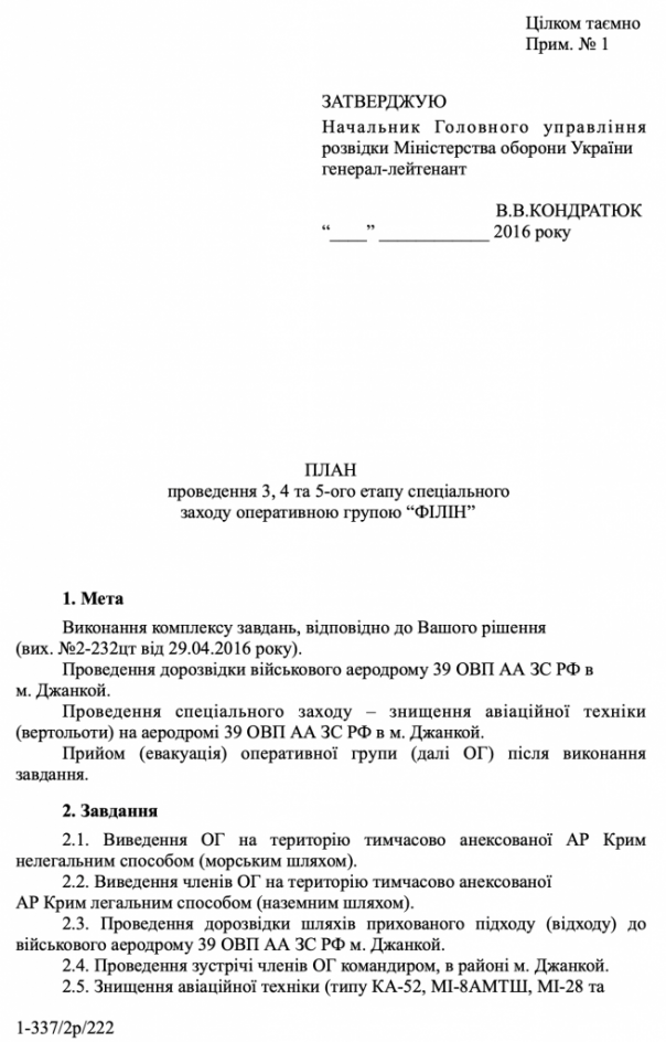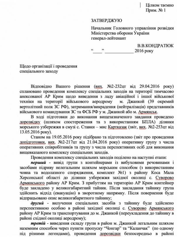 План многоходовой операции взрывать, сжигать и убивать в Крыму долго вызревал в головах сотрудников Специального резерва ГУР Минобороны Украины. Еще 3 февраля 2016 г. начальнику ГУР МОУ генерал-лейтенанту Кондратюку В.В. было доложено, что на территории ранее законсервированного аэродрома в г. Джанкой Республики Крым «командование ВС РФ создало и развернуло 39 отдельный вертолетный полк армейской авиации». На вооружении полка — десятки новейших и модернизированных ударных вертолетов, развернута батарея ПВО «Панцирь С1».