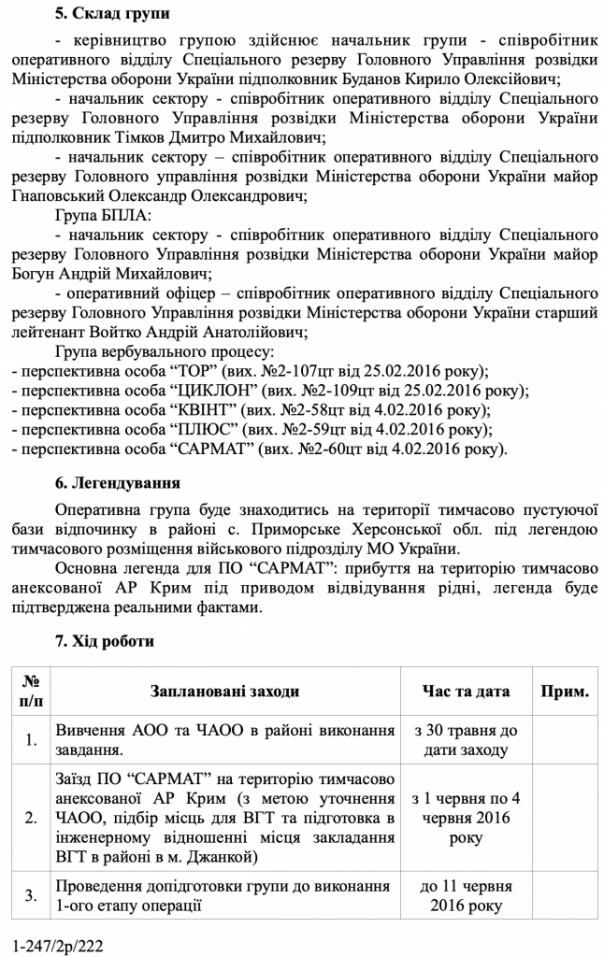 Основу группы составили действующие сотрудники военной разведки МОУ и боевики тербатов и воинских частей ВСУ с опытом боевых действий в Донбассе. А вскоре план операции был подписан тогдашним начальником Главного управления разведки генерал-лейтенантом Валерием Кондратюком (в 2020 г. за организацию диверсий и терактов на территории РФ и Донбасса он поощрен «миролюбивым» Зеленским назначением на должность главы Службы внешней разведки Украины — О.П.)