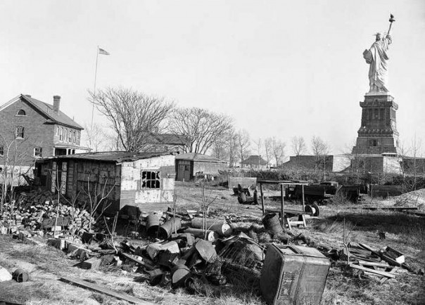 Статуя Свободы стоит среди мусора на острове Бедлоу в гавани Нью-Йорка, 5 марта 1948 года.