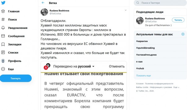 Отблагодарили. Huawei послал миллионы защитных масок нуждающимся странам Европы: миллион в Испанию, 800 000 в больницы и дома престарелых в Голландии... Но чиновник из верхушки ЕС обвинил Huawei в дешёвом пиаре. Huawei извинился и сказал, что больше не будет так поступать, - комментирует в Twitter Ruslana Boshirova @ValLisitsa.